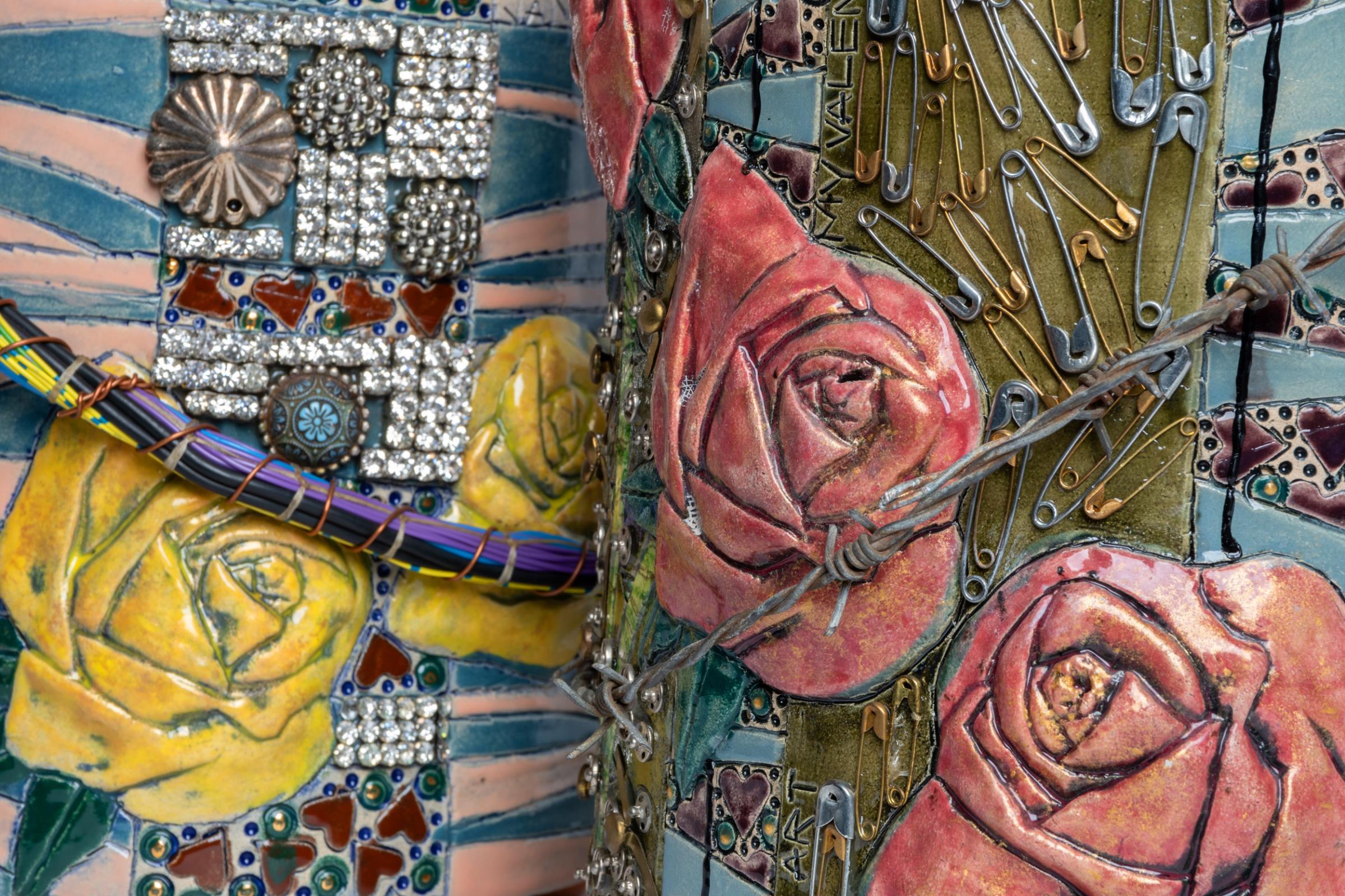 two ceramic pieces that form a pair of ceramic vessels, with found objects attached