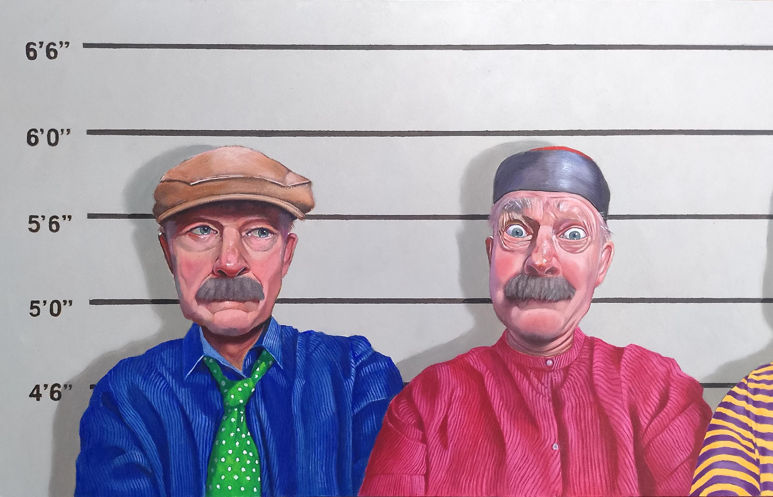 Encountering one’s doppelgänger is a rare enough occurrence, so I wanted an unusual circumstance whereby five doppelgängers would all meet, hence the identity parade line-up. This group of suspects is metaphorically and literally a snapshot showing, from left to right, the wealthiest to the poorest in society. The underlying message being that ‘under the skin we are all just the same’.